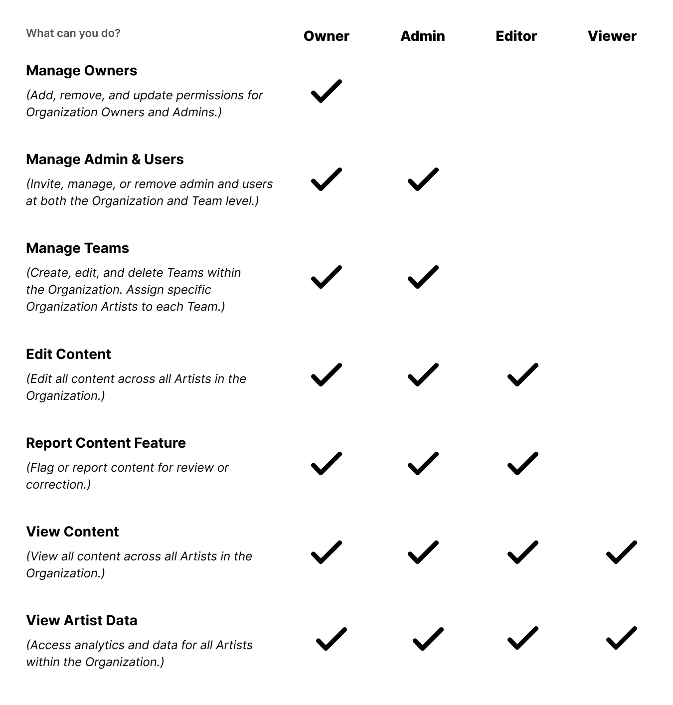Use for content managers or team members who need to actively upload, edit, or manage content and view data across all artists in the Organization. Editors have full content editing access but can’t manage users.