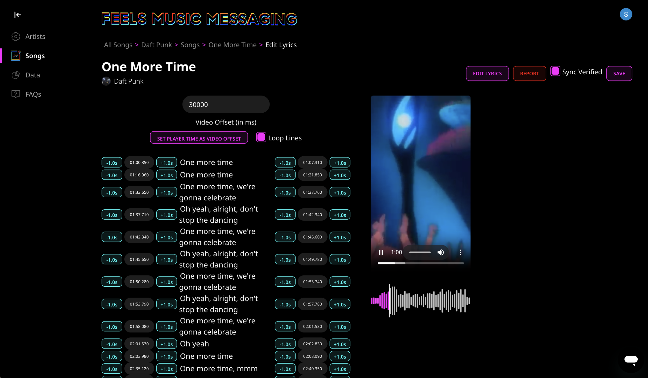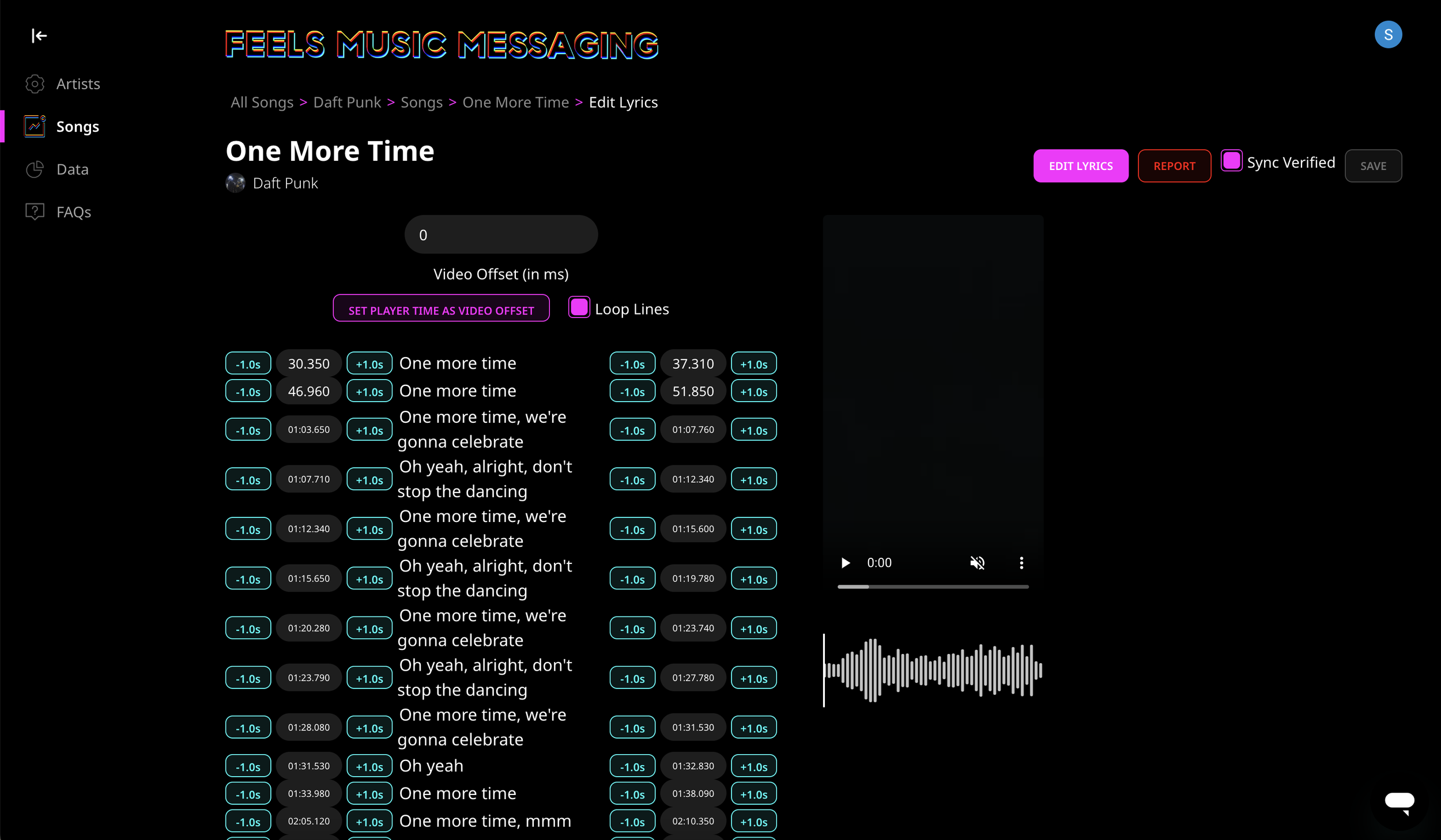 Once every line is perfectly aligned to your preference, click the 'Sync Verified' button. Sync Verified is your confirmation that the song has been properly timed using the retiming tool.